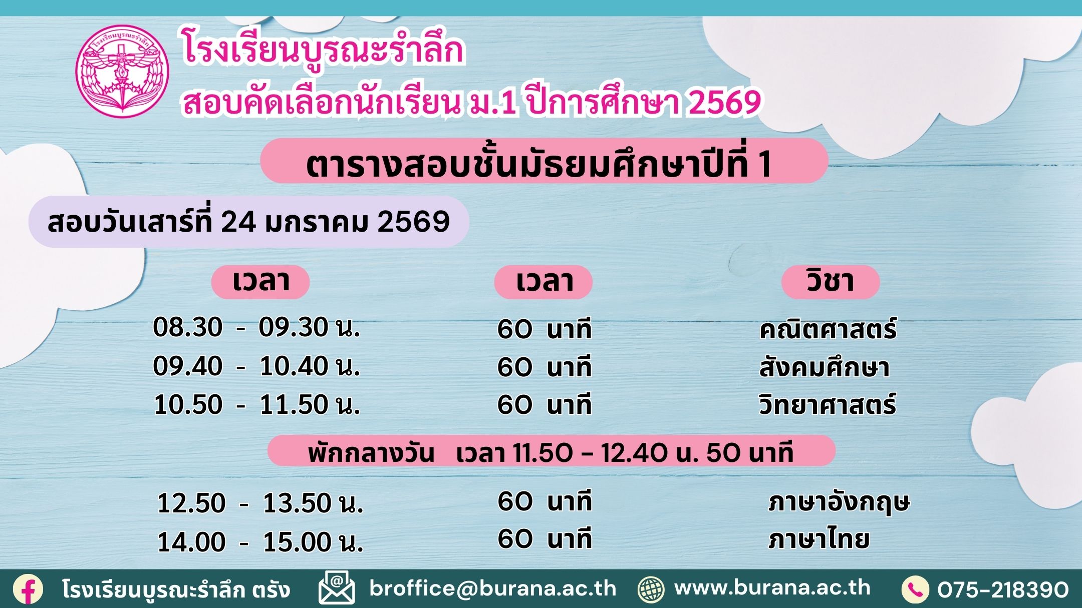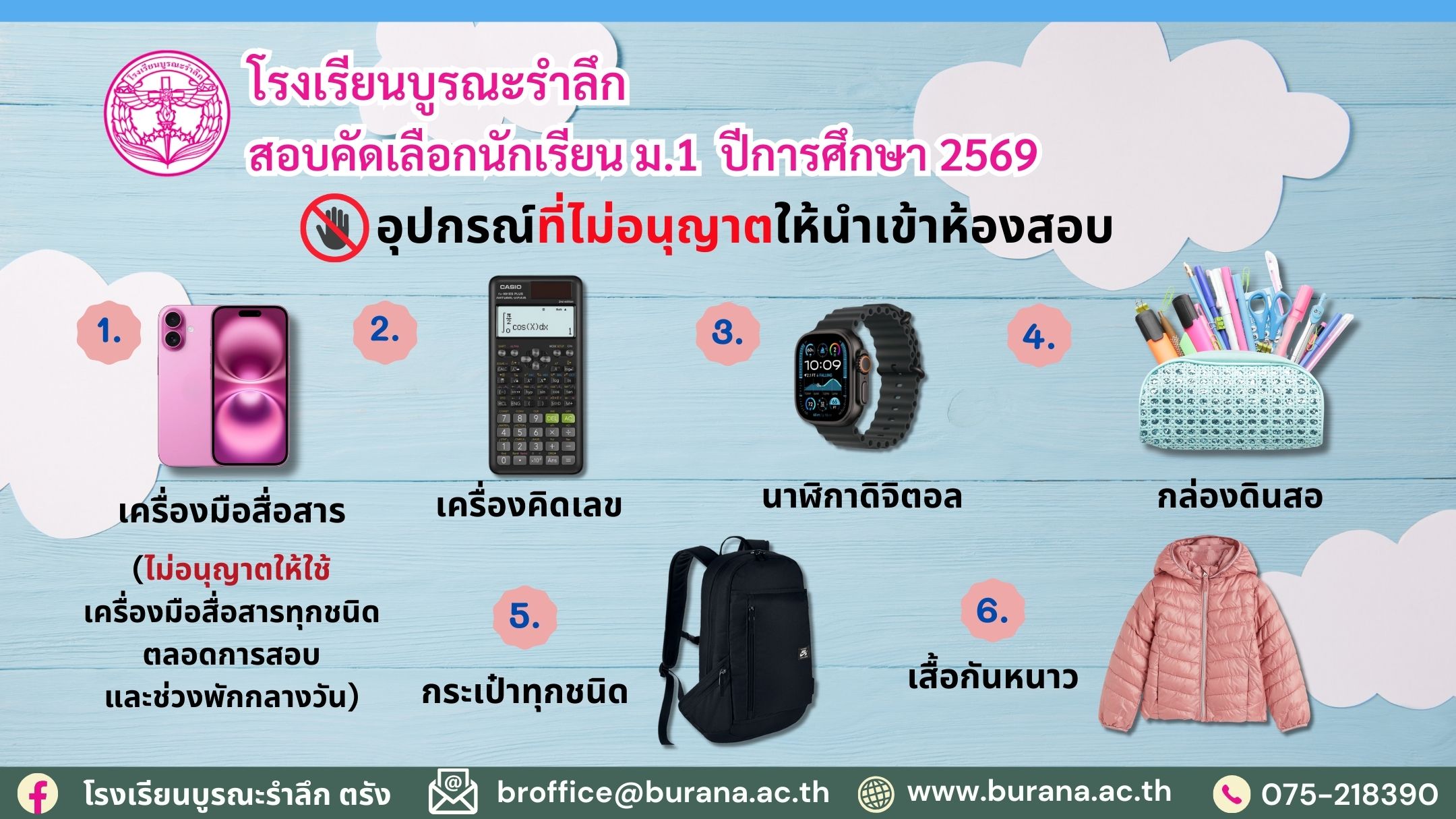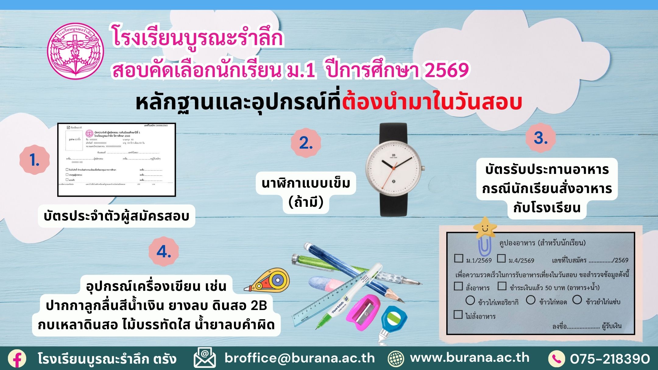ข่าวสารประชาสัมพันธ์ ประกาศรายชื่อ ผู้มีสิทธิ์สอบคัดเลือก เพื่อเข้าศึกษาต่อระดับชั้น ม.1 2569 มกราคม 22, 2026มกราคม 22, 2026 ผู้ดูแลเว็บ โรงเรียนบูรณะรำลึก รายชื่อผู้มีสิทธิ์สอบคัดเลือกเพื่อเข้าศึกษาต่อระดับชั้น ม.1 ปีการศึกษา 2569 คลิกที่นี่