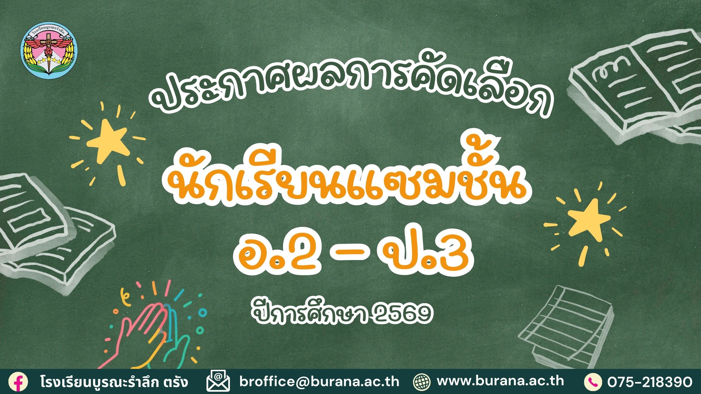 ข่าวสารนักเรียน ประกาศผลการคัดเลือกนักเรียนแซมชั้น อ.2 – ป.3 ปีการศึกษา 2569 มกราคม 28, 2026 ผู้ดูแลเว็บ โรงเรียนบูรณะรำลึก 📢📢 ประกาศผลการสอบแซมชั้น ระดับอนุบาล 2 ถึง ประถมศึกษาปีที่ 3 ปีการศึกษา 2569 คลิกที่นี่